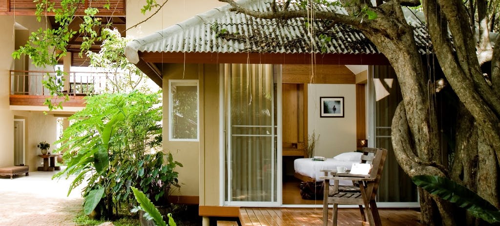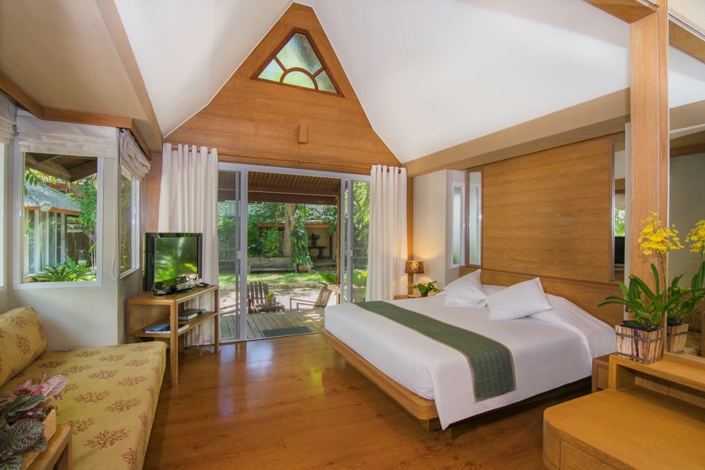 บังกะโลน่าพักที่ตั้งอยู่ท่ามกลางสวนหย่อมเขียวขจี มีเตียงโซฟา ใกล้ชายหาด