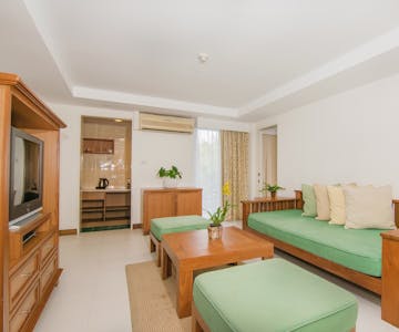 ห้องสวีทมีห้องนั่งเล่นและมุมครัวแยกเป็นสัดส่วน
