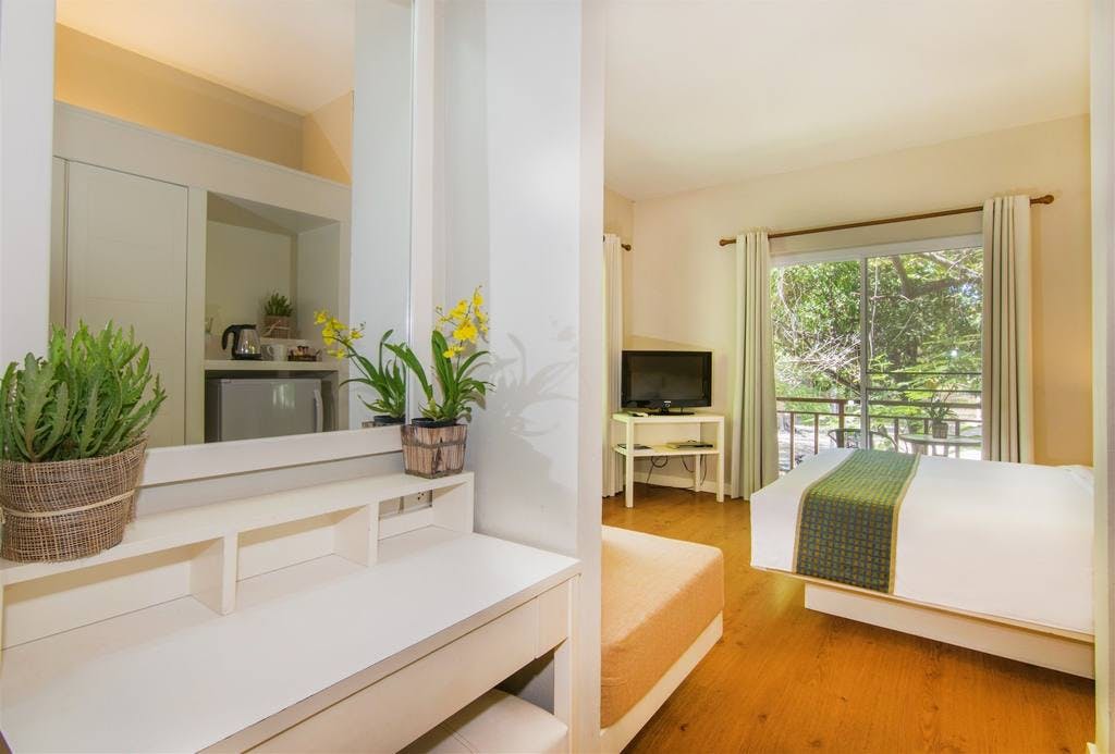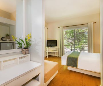 วิลลาไทยโบราณมีเตียงโซฟาและระเบียงส่วนตัว